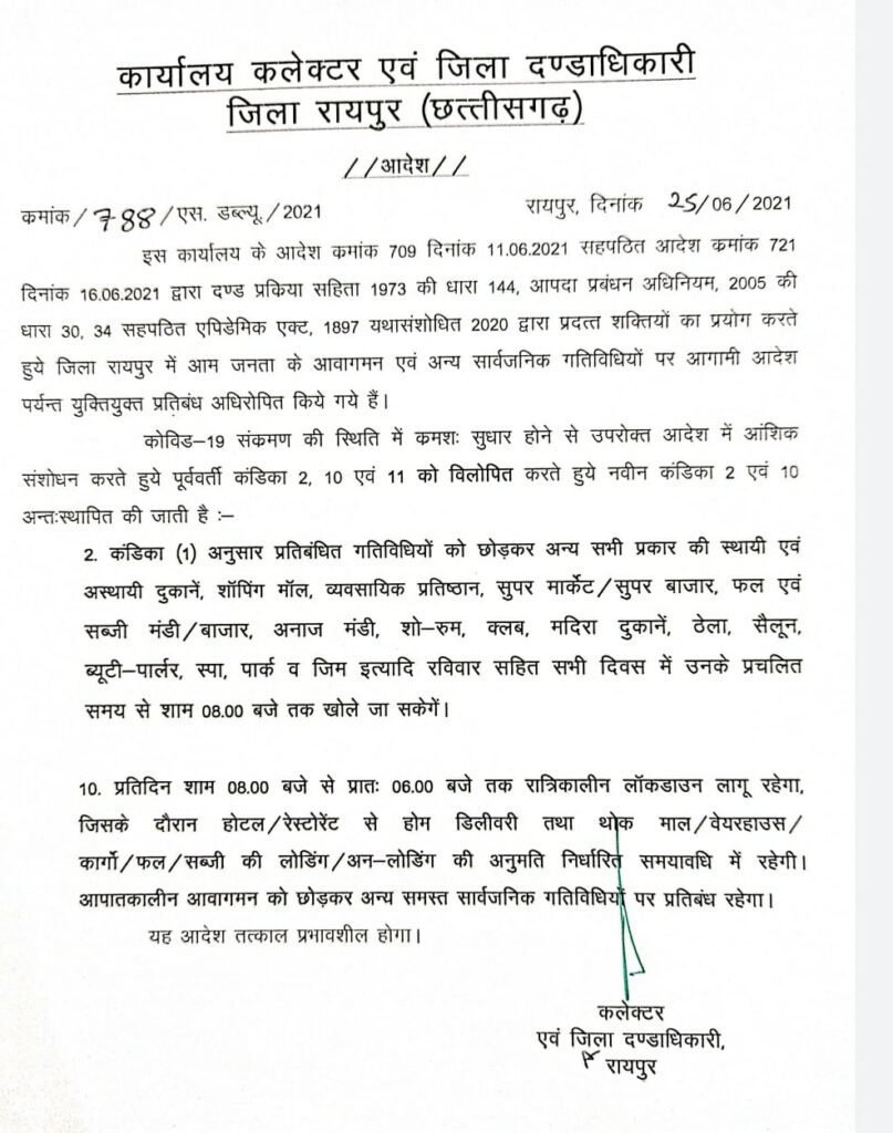 जारी आदेश के अनुसार प्रतिबंधित गतिविधियों को छोड़कर अन्य सभी प्रकार की स्थाई व अस्थाई दुकानें,शॉपिंग मॉल, सैलून, ब्यूटी पार्लर, मदिरा दुकानें सुपर मार्केट व बाजार सहित सभी दुकानें रात 8 बजे तक खुलेंगी। कलेक्टर सौरभ कुमार ने शुक्रवार को आदेश जारी किया है।
