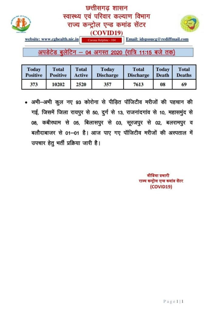 रायपुर। देर रात्रि की रिपोर्ट अनुसार अभी अभी प्रदेश में विभिन्न जिलों से 373 कोरोना पॉजिटिव मरीजों की पहचान की गई है। जिसमें से 93 नए मामले अभी मिले हैं। वहीं 357 कोरोना संक्रमित मरीजों को स्वस्थ होने के बाद विभिन्न अस्पतालों से डिस्चार्ज कर दिया गया है।