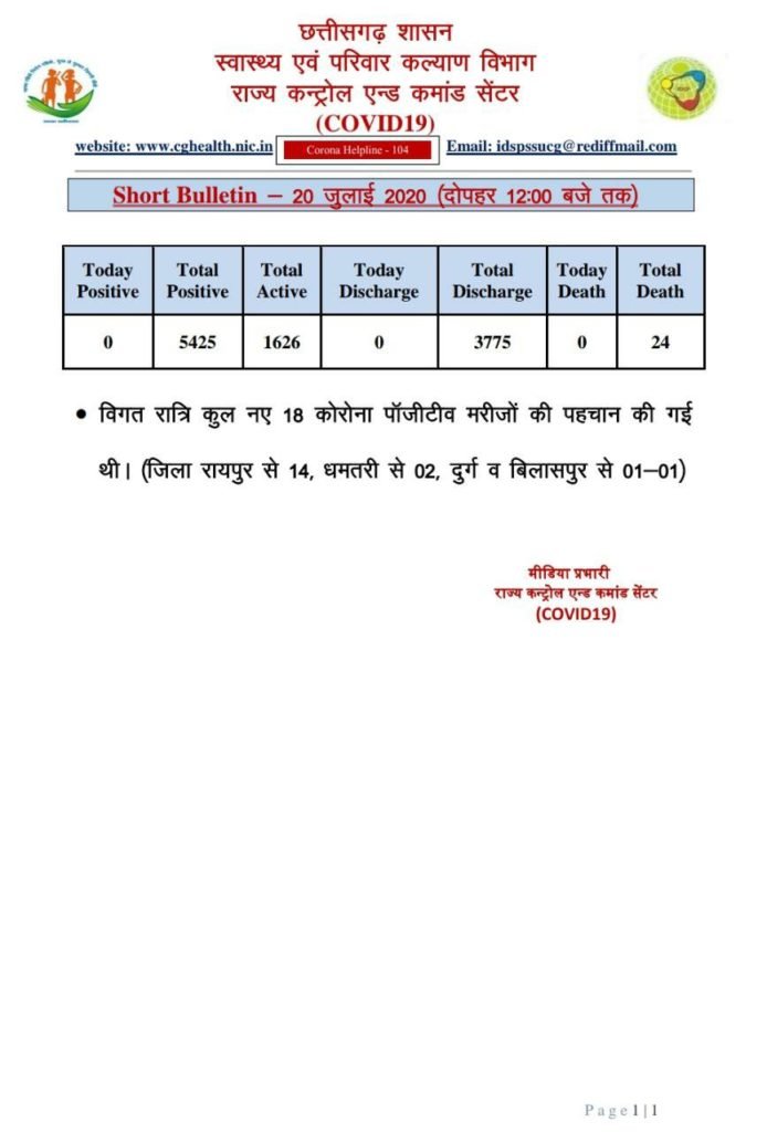 स्वास्थ्य विभाग ने आज अपने मेडिकल बुलेटिन में यह जानकारी देते हुए बताया कि आज पाए गए 1626 कुल पॉजिटिव कोरोना संक्रमित मरीजों में से जिला रायपुर से 14, धमतरी से 02 दुर्ग- बिलासपुर से 1-1 है।