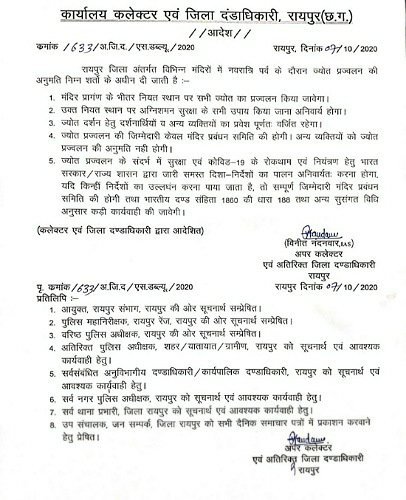 रायपुर। नवरात्रि में मंदिरों में ज्योत प्रज्वलन की अनुमति दिदी गई है। आदेश के अनुसार ज्योत दर्शन की अनुमाती भक्तों को नही दी जाएगी। साथ ही कोविड-19 कि रोकथाम के लिए दिए गए निर्देशों का पालन मंदिर प्रबंधन को करना होगा।