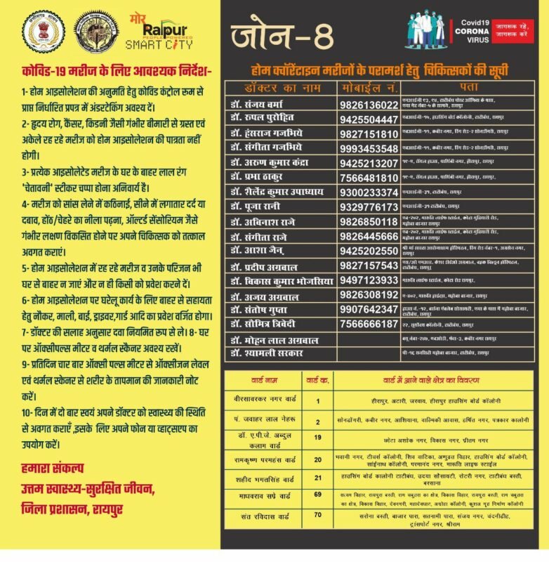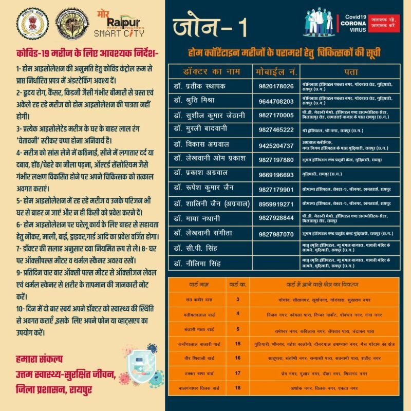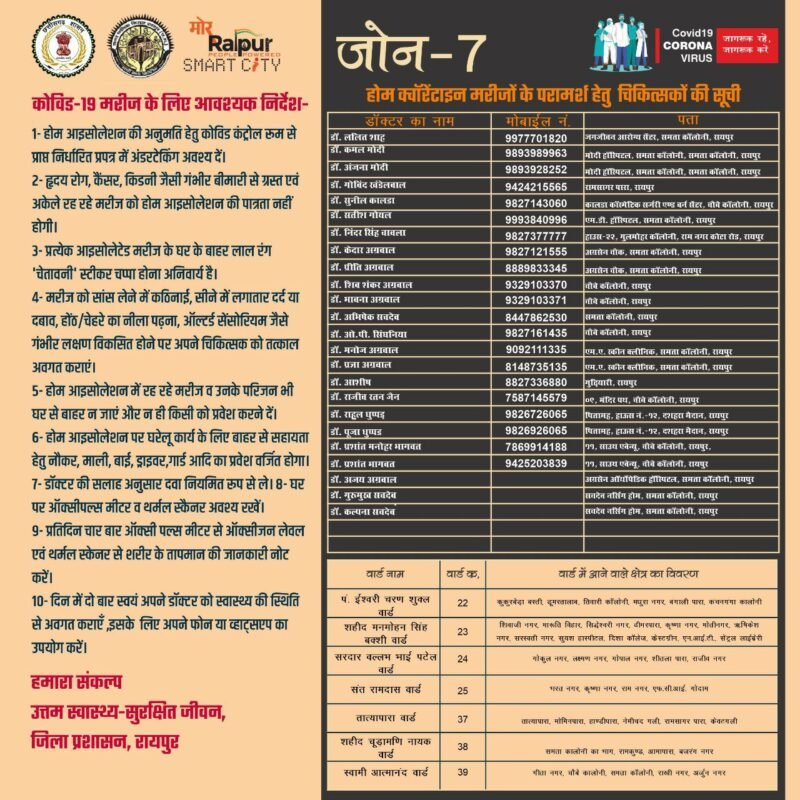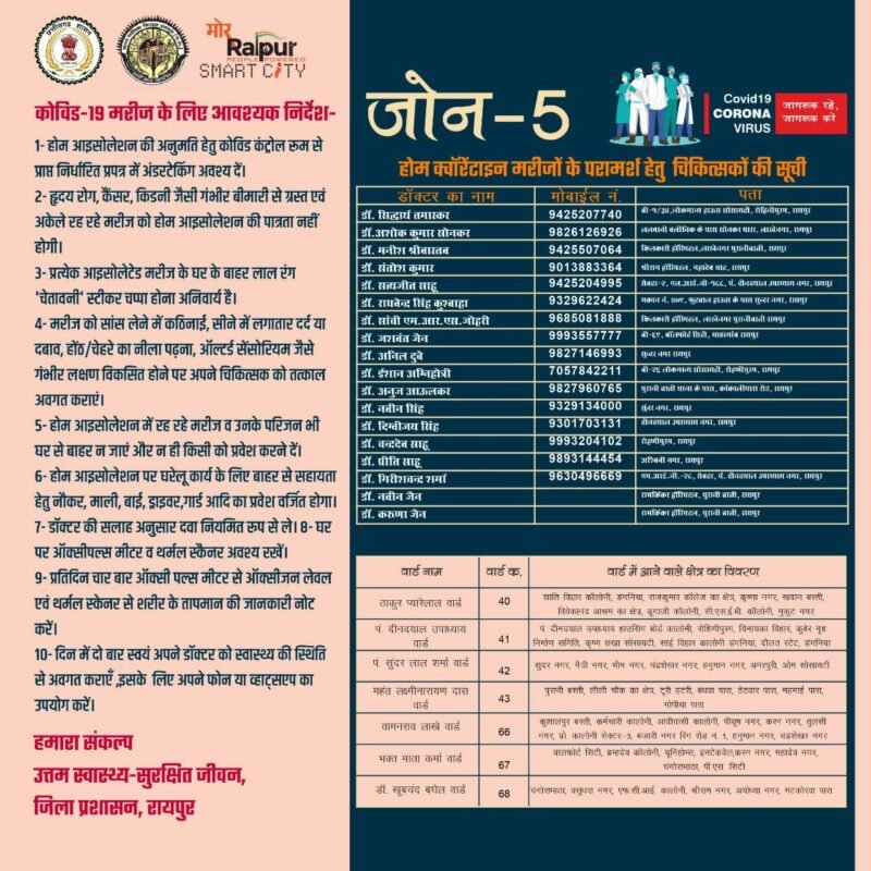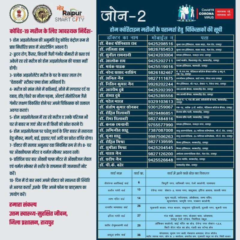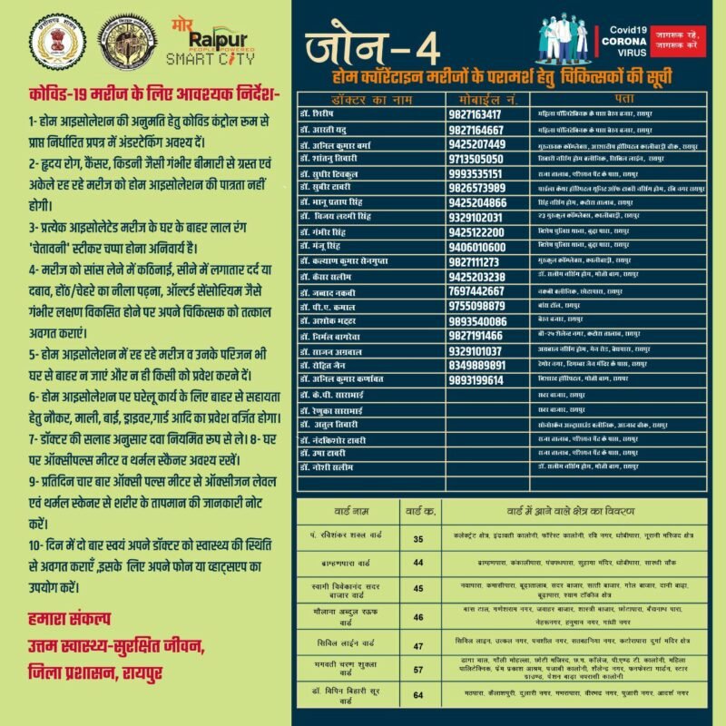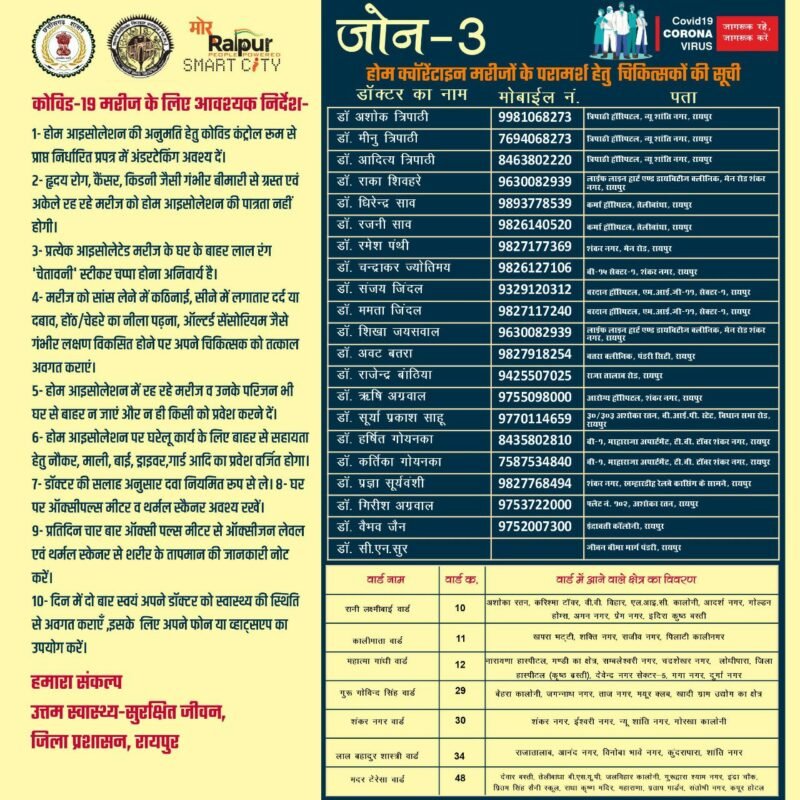 प्रतिदिन चार बार ऑक्सीजन मीटर से ऑक्सीजन लेवल एवं थर्मल स्क्रेनिग से शरीर का तापमान की जानकारी दिन में दो बार स्वयं को स्वास्थ्य की स्थिति से अवगत कराना होगा इसके अलावा दवाई और स्वास्थ्य से जुड़ी किसी भी तरह की जानकारी संबंधित व्यक्ति डॉक्टर से फोन के द्वारा ले सकता है। घरों में रहने वाले मरीजों को किसी भी तरह की परामर्श से संबंधित दिक्कत ना हो इसके लिए शासन ने डॉक्टरों की लिस्ट जारी किया है। इसमें सभी एरिया के अलग डॉक्टर हैं जिनका फोन नंबर भी साथ में दिया गया है।