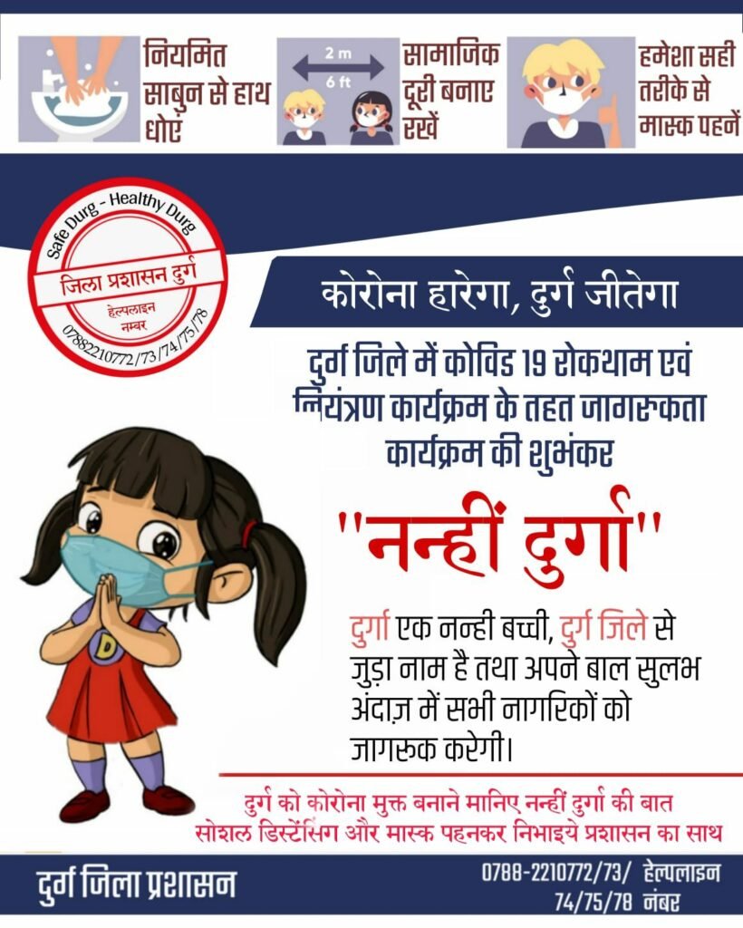 दुर्ग जिले में अब नन्हीं दुर्गा ने कोविड-19 जागरूकता अभियान की कमान संभाली है। नन्हीं दुर्गा कोरोना जागरूकता अभियान की आधिकारिक शुभंकर होगी।आज कलेक्टर डॉ सर्वेश्वर भुरे द्वारा आधिकारिक रूप से ‘नन्हीं दुर्गा’ के कटआउट का विमोचन किया गया। नवरात्र के अवसर एक तरफ नवरात्र के अवसर पर दुर्गा पंडालों में कोरोना संकट से बचाव के लिए श्रद्धालु आराधना कर रहे हैं।वहीं नन्हीं दुर्गा ने दुर्ग के नागरिकों को जागरुक करने की ज़िम्मेदारी उठाई है।