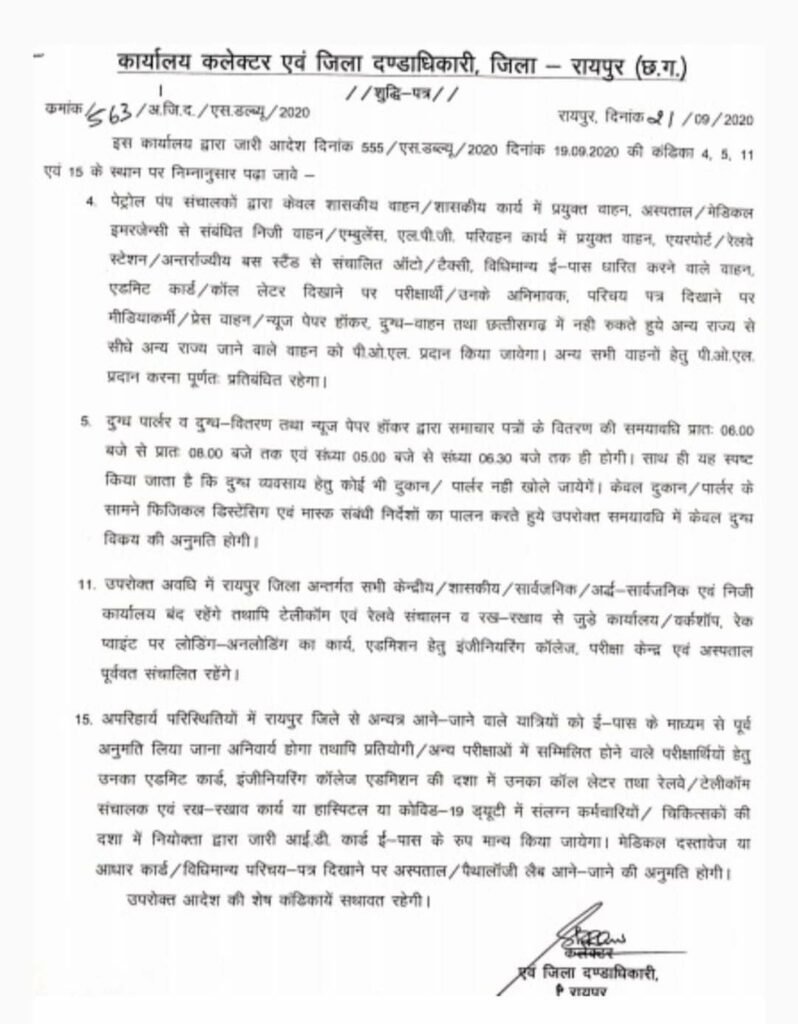 शर्तो में रियायत देते हुए पैट्रोल पंप के संचालकों अब अंतराज्यीय बस स्टैंड से संचालित आटो, टैक्सी विधि मान्य इस पास धारित वाहन, एडमिट कार्ड या काल लेटर दिखाने पर परीक्षार्थी या उनके अभिभावक, परिचय पत्र दिखाने पर मीडियाकर्मी प्रेस की गाड़ियों, न्यूज पेपर हाकर, दूध की गाड़ियों और अंतर्राज्यीय बस सेवाओं को ईंधन दिया जाएगा। लॉकडाउन में सभी केन्द्रीय, शासकीय सार्वजनिक व अर्ध सार्वजनिक व निजी कार्यलय बंद रहेंगे। इसके साथ ही वर्कशाप, इंजीनियरिंग कॉलेज में एडमिशन परीक्षा केन्द्र व अस्पताल संचालित रहेंगे।