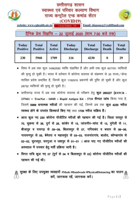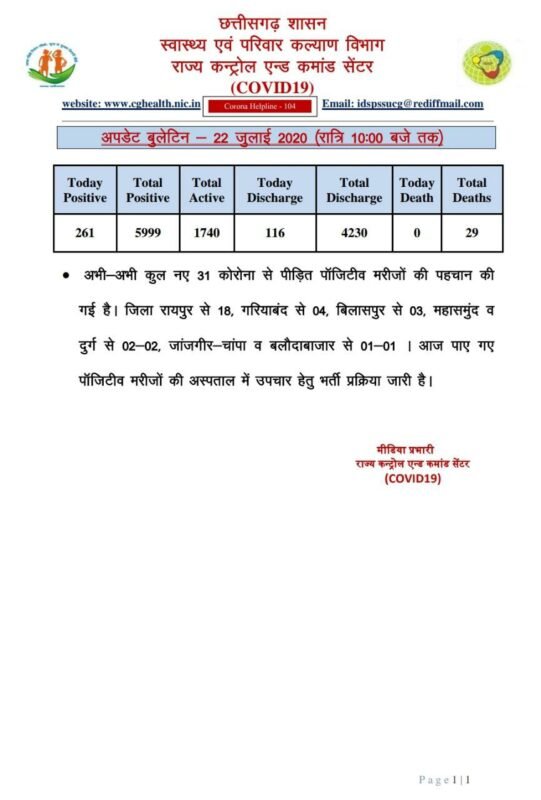 स्वास्थ्य विभाग ने अपने देर रात मेडिकल बुलेटिन में जानकारी देते हुए बताया कि आज पाए गए 261 कोरोना संक्रमित मरीजों में, रायपुर जिला से 88 , सुकमा से 36, दुर्ग से 30, कांकेर से 15, जांजगीर-चांपा से 14, मुंगेली से 11, बीजापुर से 9, रायगढ़ से 9, बिलासपुर से 10, गरियाबंद से 10, बस्तर से 6, नारायणपुर से 5, बेमेतरा से 3, महासमुन्द से 3, राजनांदगांव से 2, बालोद से 2, कोण्डागांव से 2 ,बलौदाबाजार, सूरजपुर, सरगुजा और जशपुर से एक-एक मरीज शामिल है।