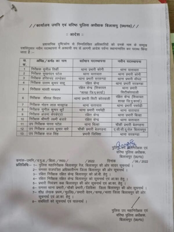 बिलासपुर एसपी पारुल माथुर ने ट्रांसफर आदेश जारी किया है।