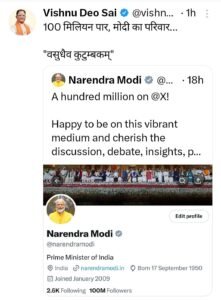 प्रधानमंत्री मोदी की वैश्विक लोकप्रियता अद्वितीय है। विभिन्न सोशल मीडिया साइट्स पर उनके करोड़ों फॉलोअर्स हैं। मुख्यमंत्री विष्णुदेव साय ने प्रधानमंत्री नरेंद्र मोदी के 100 मिलियन फॉलोवर्स होने पर अपने एक्स हैंडल पर लिखा, “100 मिलियन पार, मोदी का परिवार। ‘वसुधैव कुटुम्बकम्’।”
