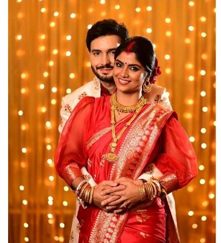 सायंतनी घोष और अनुग्रह तिवारी ने कोलकाता में परिवार के कुछ लोगों के बीच बंगाली रीति रिवाज से सात फेरे लिए। कपल की शादी की तस्वीरें इंटरनेट पर तेजी से वायरल हो रही हैं। लुक की बात करें तो सायंतनी सुर्ख लाल बनारसी साड़ी में दुल्हन बनीं।