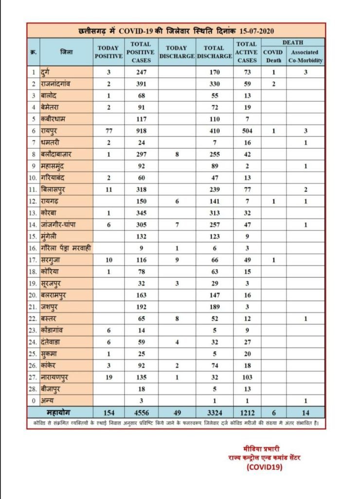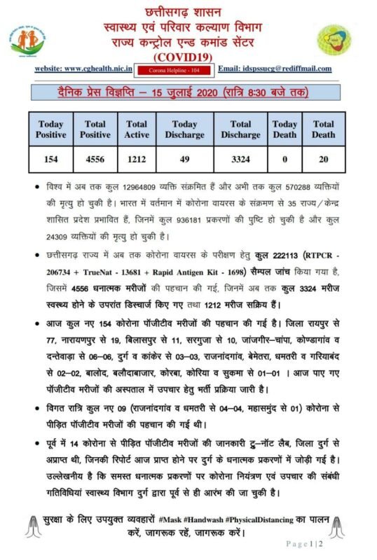 रायपुर। राज्य में अनलॉक 2 की प्रक्रिया के बाद से कोविड के मरीज़ों में लगातार वृद्धि हो रही है। इसी बीच स्वास्थ्य विभाग ने अपने दैनिक मेडिकल बुलेटिन जारी किया है। स्वास्थ्य विभाग ने आज के कोरोना मरीज़ों स्थिति की जानकारी देते हुए बताया की राज्य में आज कुल 154 नए मरीज़ मिले हैं। वहीँ ठीक होने वालों की संख्या 49 है।