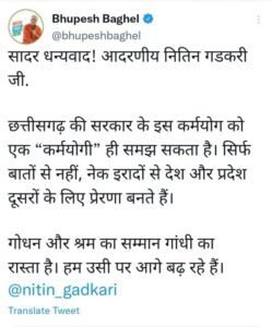 नितिन गडकरी ने ट्वीट कर लिखा है कि छत्तीसगढ़ के सरकारी विभागीय निर्माण में गोबर से बने प्राकृतिक पेंट के इस्तेमाल का निर्देश छत्तीसगढ़ के मुख्यमंत्री भूपेश बघेल ने दिया है, उनके इस फैसले का अभिनंदन करता हूं, मुख्यमंत्री भूपेश बघेल का ये फैसला सराहनीय और स्वागत योग्य है। मुख्यमंत्री भूपेश बघेल ने भी ट्वीट करते हुए केंद्रीय मंत्री नितिन गड़करी को धन्यवाद देते हुए कहा है कि नेक इरादों से ही देश और प्रदेश दूसरों के लिए प्रेरणा बनते है। सीएम बघेल ने कहा है कि गोधन और श्रम का सम्मान कर छत्तीसगढ़ गांधी जी के रास्ते पर आगे बढ़ रहा है।