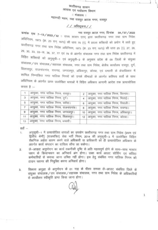 नई अधिसूचना के अनुसार प्रदेश के 9 जिलों के 13 नगर पालिक निगमों रायपुर, बीरगांव, दुर्ग, भिलाई, चरौदा, रिसाली, राजनांदगांव, रायगढ़, जगदलपुर, अम्बिकापुर, बिलासपुर, कोरबा और धमतरी में यह सुविधा मिलेगी। चिरमिरी नगर निगम इसमें शामिल नहीं है। अधिसूचना में यह भी कहा गया है कि ले-आउट के अनुमोदन का कार्य तकनीकी दृष्टि से महत्वपूर्ण होने के साथ-साथ मास्टर प्लान के क्रियान्वयन का महत्वपूर्ण अंग होगा। ऐसे में नगर तथा ग्राम निवेश विभाग ने जो अधिकार नगर निगमों को दिया है उसका क्रियान्वयन भी उसी स्तर और शैक्षणिक योग्यता वाले अधिकारी से कराया जा सकता है जो पहले वह काम कर रहे थे। इसका मतलब है कि संबंधित नगर निगमों को ले-आउट अनुमोदन के लिए अनिवार्य रूप से टाउन प्लानर की नियुक्ति करनी होगी। अधिसूचना में साफ तौर पर कहा गया है, ले-आउट की अनुमति जारी करने में छत्तीसगढ़ नगर तथा ग्राम निवेश अधिनियम, छत्तीसगढ़ भूमि विकास अधिनियम, छत्तीसगढ़ नगर तथा ग्राम निवेश नियम और विकास योजना के मापदण्डों का उल्लंघन हुआ या अतिक्रमण हुआ तो उसके लिए संबंधित नगर निगम जिम्मेदार होंगे।