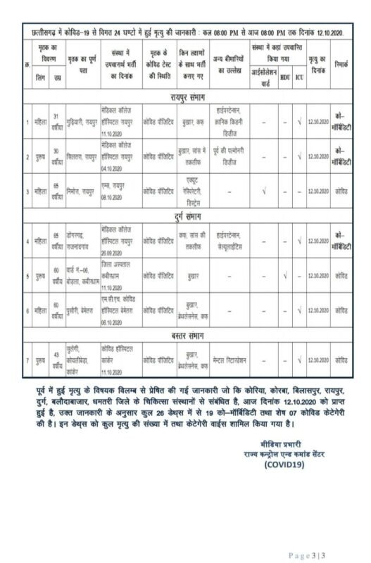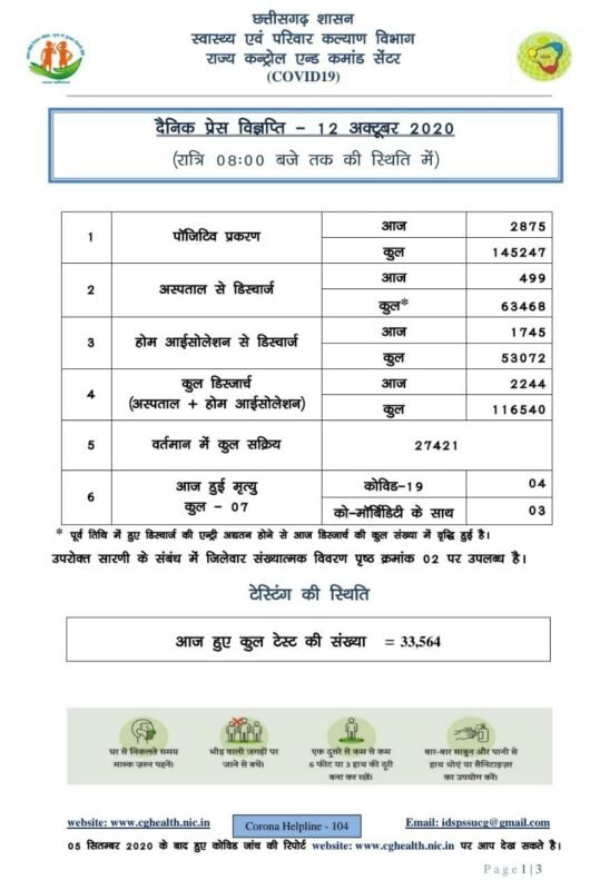 रायपुर। छत्तीसगढ़ में सोमवार को 2858 कोरोना पॉजिटिव मरीजों की पहचान हुई है। 2244 मरीज स्वस्थ हुए हैं। आज थोड़ा कम 07 मरीजों की मौत हुई है। विभाग ने रात 8 बजे की स्थिति में मेडिकल बुलेटिन जारी की है। प्रदेश में अब तक 145247 मरीजों की पहचान हो चुकी है। इनमें से 116540 मरीज स्वस्थ हो चुके हैं। 1286 मरीजों की मौत हो चुकी है। प्रदेश में एक्टिव केस 27421 हैं।