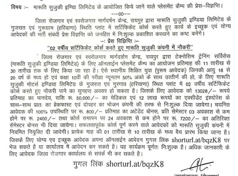रायपुर। जिला रोजगार एवं स्वरोजगार मार्गदर्शन केन्द्र, रायपुर द्वारा टेक्नोसिम ट्रेनिंग सर्विसेस (मारूति सुजुकी इण्डिया लिमिटेड) के लिए ऑनलाईन प्लेसमेंट कैम्प का आयोजन प्रतिमाह की 11 तारीख से 30 तारीख तक के लिए किया जा रहा है। ऐसे स्थानीय शिक्षित युवा पुरूष आवेदक जिनकी आयु 18 से 20 वर्ष के मध्य हो, जिन्होंने कक्षा 10वीं की परीक्षा न्यूनतम 50 प्रतिशत अंकों के साथ उत्तीर्ण किया हो उनके लिए मारूति सुजुकी मोटर्स इण्डिया लिमिटेड के गुजरात एवं गुरगांव (हरियाणा) स्थित प्लांट में 2 वर्षीय सर्टिफिकेट कोर्स करते हुए नौकरी पाने का सुनहरा अवसर हो सकता है।