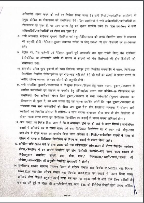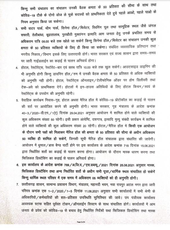 इसके साथ ही शहर के अन्य पार्क, वाटर पार्क, स्टेडियम, स्पोर्टस काम्पलेक्स, स्वीमिंग पूल, पुरखौती मुक्तांगन, जंगल सफारी, तेलीबांधा, बूढ़ा तालाब को खोले की अनुमति भी दी गई है। रात आठ बजे तक इन स्थानों को खोला जा सकेगा। यहां सभी तरह के कोरोना प्रोटोकॉल का पालन करना अनिवार्य होगा।