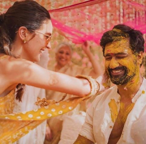 इन तस्वीरों में जहां कैटरीना कैफ खूबसूरत व्हाइट लहंगे में नजर आ रही हैं वहीं विक्की कौशल ने केवल एक गुलाबी रंग का दुपट्टा गले में डाला हुआ है और नीचे पजामा पहना है। दोनों के ही चेहरे पर हल्दी लगी हुई है, जिसमें वह काफी जंच रहे हैं।