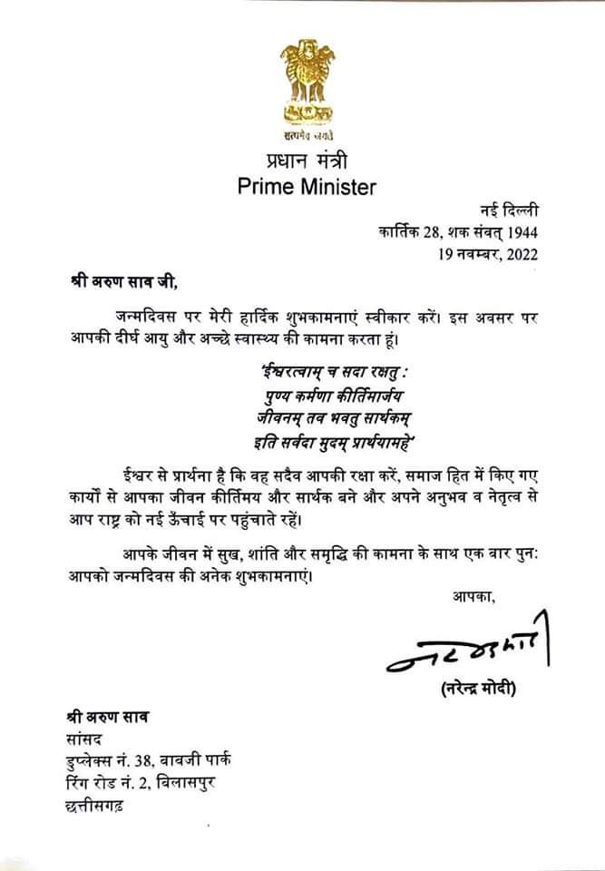 रायपुर। भाजपा प्रदेशाध्यक्ष अरुण साव का 25 नवम्बर को जन्मदिन था। उनके जन्मदिन पर प्रधानमंत्री नरेन्द्र मोदी ने उन्हें बधाई संदेश भेजा है। इस बधाई संदेश को पाकर श्री साव खासे अभुभित नज़र आए, उन्होंने सोशल मीडिया में शेयर करते हुए प्रधानमंत्री का आभार जताया।