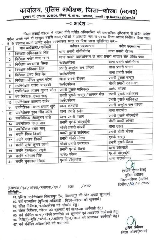 कोरबा। जिले में पुलिस विभाग में बड़ी संख्या में तबादला किया गया है। जारी आदेश में कुल 21 अधिकारियों का नाम शामिल किया गया है। आदेश कोरबा एसपी संतोष सिंह ने जारी किया है।