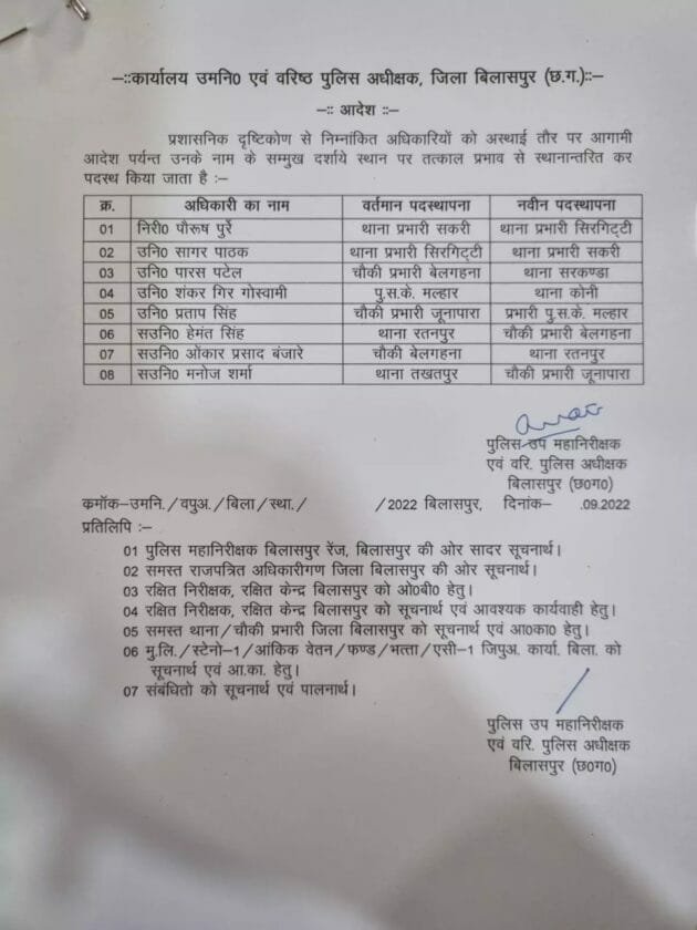 बिलासपुर जिले के पुलिसकर्मियों का हुआ तबादला, देखें आदेश