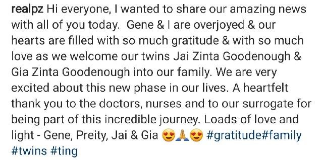 एक्ट्रेस द्वारा शेयर किए गए पोस्ट में देखा जा सकता है कि प्रीति ने पति जीन के साथ एक हैप्पी तस्वीर शेयर की है और कैप्शन में लिखा- ‘सबको मेरा नमस्कार, मैं आज आप सभी के साथ एक बड़ी खबर शेयर करना चाहती हूं। जीन और मैं बहुत खुश हैं और हमारे दिल इस समय प्यार से भर गए हैं। हम अपने परिवार में अपने जुड़वां बच्चों जय जिंटा गुडनईफ और जिया जिंटा गुडएनईफ का स्वागत करते हैं।’