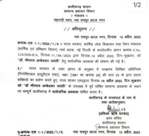 रायपुर। भारत सरकार ने डॉ. भीमराव अंबेडकर जयंती पर अवकाश घोषित करने का आदेश जारी किया था, इस पर इस पर राज्य सरकार ने अमल करते हुए शुक्रवार दिनांक 14 अप्रैल को सार्वजनिक अवकाश घोषित कर दिया है। इसके लिए आदेश जारी हो चुका है।