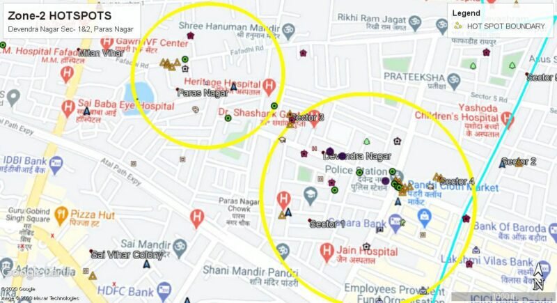 जोन क्रमांक 02- देवेन्द्र नगर सेक्टर 1, 2 , पारस नगर, गुढियारी, साहू पारा, मंगल बाजार. जवाहर नगर, राठौर चैक, तेलघानी नाका, नहर पारा।