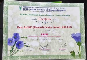 रायपुर। इंदिरा गांधी कृषि विश्वविद्यालय (आईजीकेवी), रायपुर के लिए गौरव का क्षण आया है। यहां संचालित अखिल भारतीय समन्वित अनुसंधान परियोजना (एआईसीआरपी) अलसी को अलसी अनुसंधान एवं विकास के क्षेत्र में उत्कृष्ट योगदान के लिए “सर्वश्रेष्ठ एआईसीआरपी केंद्र पुरस्कार” से सम्मानित किया गया। यह पुरस्कार भारतीय कृषि अनुसंधान परिषद (ICAR) द्वारा प्रदान किया गया है।