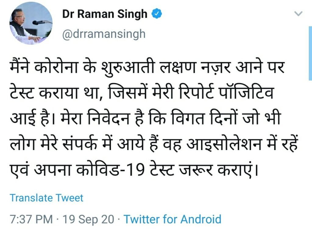 इस वक्त कोरोना संक्रमण की खबरों के बीच बड़ी खबर प्रदेश के पूर्व मुख्यमंत्री डॉ रमन सिंह को भी कोरोना हो गया है।
