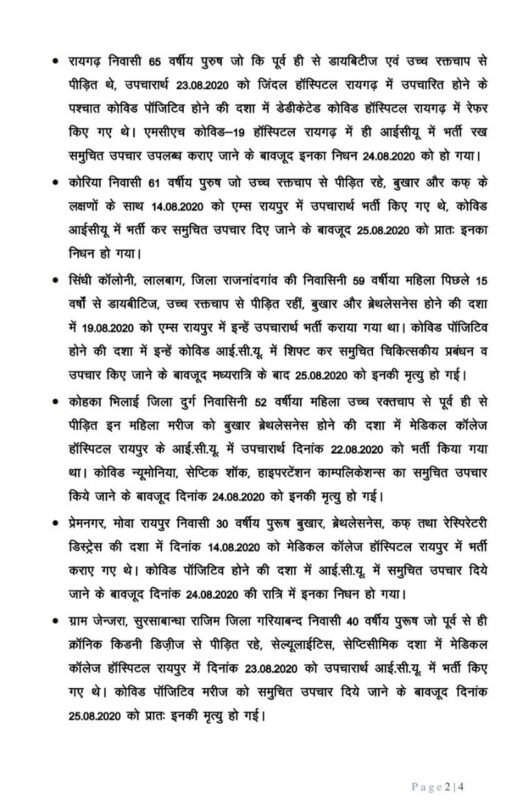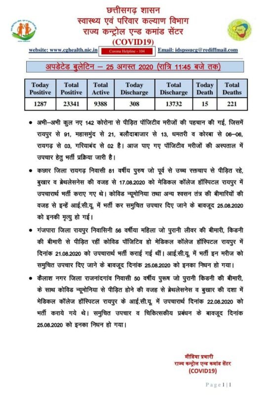स्वास्थ्य विभाग ने रात 12.00 बजे तक अपने मेडिकल बुलेटिन में यह जानकारी देते हुए बताया कि आज पाए गए 1287 कोरोना संक्रमित मरीजों में से जिला रायपुर से 455, रायगढ़ से 120, बिलासपुर से 104, राजनांदगांव से 85, दुर्ग से 72, दंतेवाड़ा से 70, बस्तर से 48, सरगुजा से 40, कांकेर से 38,महासमुन्द से 38,बलौदाबाजार से 36, सुकमा से 28, धमतरी से 26, बीजापुर से 25, सूरजपुर से 24, नारायणपुर से 16, कोण्डागांव से 13, कबीरधाम से 11,कोरबा से 10, गरियाबंद से 7, जांजगीर-चांपा से 5 और अन्य राज्य से 5, बालोद से 4, जशपुर से 2, बेमेतरा से एक, मुंगेली से एक, गौरेला-पेंड्रा-मरवाही से एक कोरिया से एक और बलरामपुर से एक मरीज शामिल है।