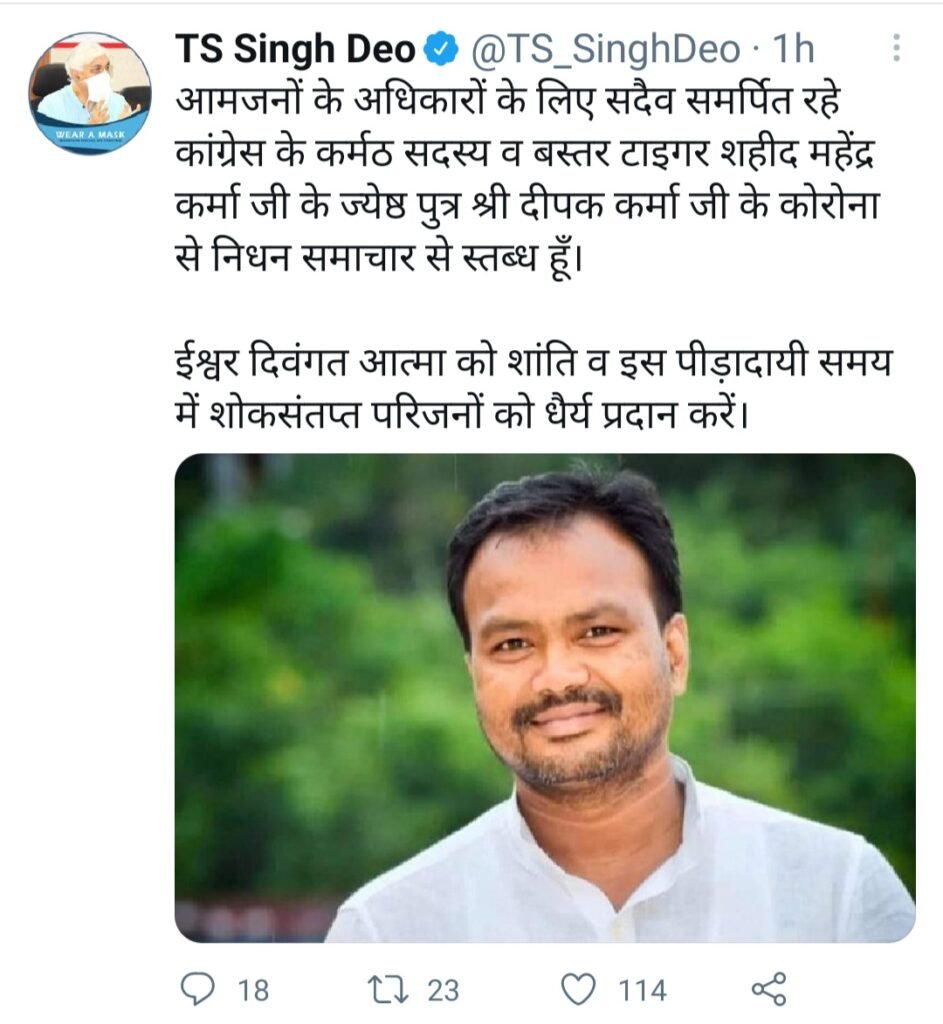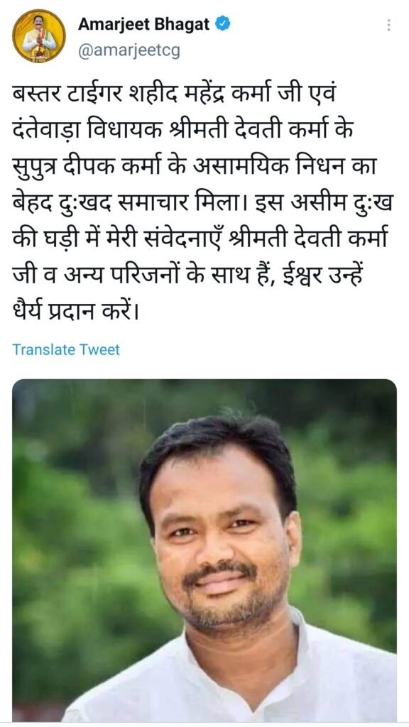 हालत के देखते हुए उन्हें एयर एम्बुलेंस से रायपुर में भर्ती कराया गया था, जहां उनका इलाज चल रहा था। बता दे कि दीपक कर्मा प्रदेश के पूर्व केबिनेट मंत्री शहीद महेंद्र कर्मा और विधायक देवती कर्मा के पुत्र थे।