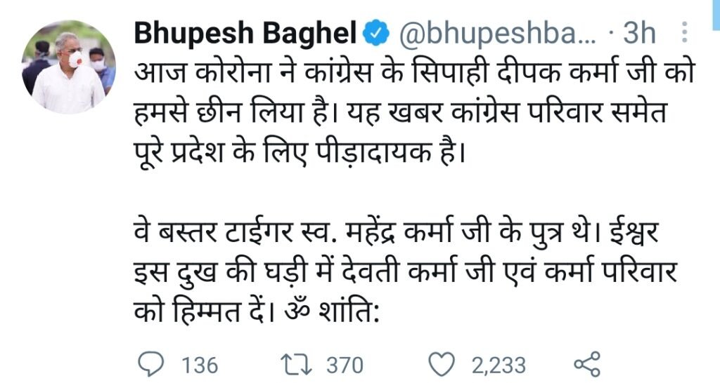 उनके आकस्मिक निधन पर मुख्यमंत्री भूपेश बघेल ने गहरा दुख व्यक्त किया है। बघेल ने कहा है कि दीपक कर्मा के रूप में हमने एक युवा नेता को खो दिया है। मुख्यमंत्री ने भगवान से दिवंगत आत्मा की शांति और शोक संतप्त परिजनों को इस दुःख को सहन करने की शक्ति प्रदान करने की प्रार्थना की है।