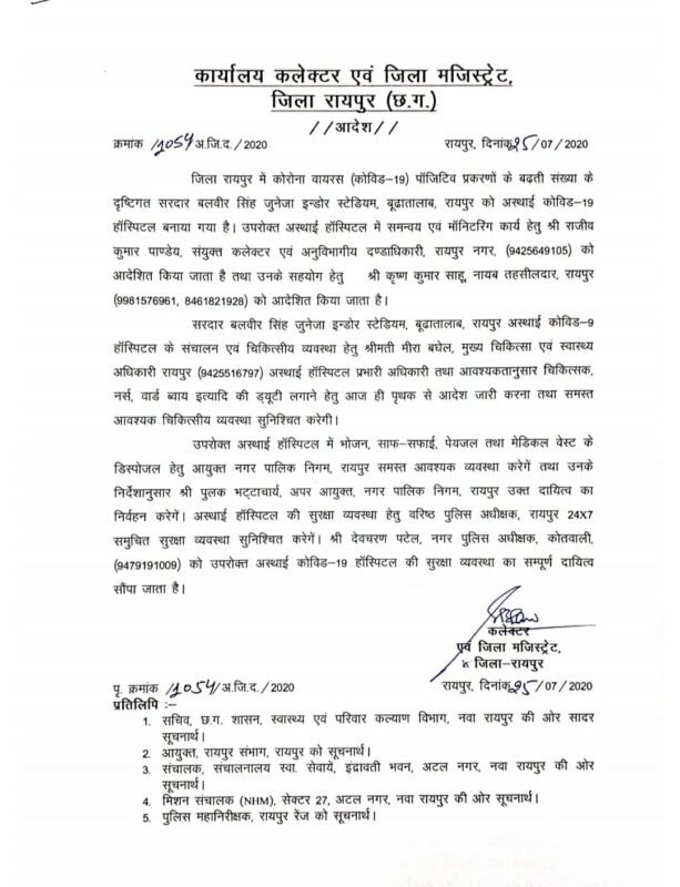 सरदार बलबीर सिंह जुनेजा इंडोर स्टेडियम बूढ़ा तालाब रायपुर अस्थाई कोविड-19 हॉस्पिटल के संचालन एवं चिकित्सा की व्यवस्था हेतु मीरा बघेल,मुख्य चिकित्सा एवं स्वास्थ्य अधिकारी रायपुर को अस्थाई हॉस्पिटल प्रभारी अधिकारी तथा उन्हें आवश्यकता अनुसार चिकित्सक, नर्स, वार्ड ब्वॉय इत्यादि की ड्यूटी लगाने हेतु आदेश जारी किया गया है तथा समस्त आवश्यक चिकित्सा की व्यवस्था सुनिश्चित करेंगे।
