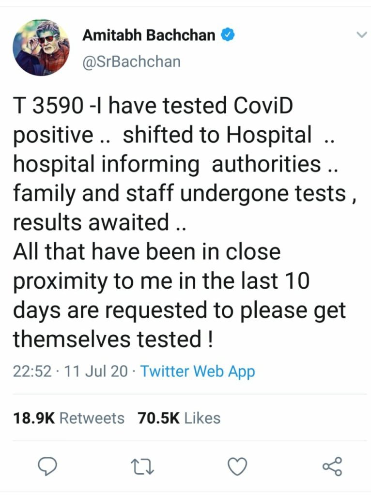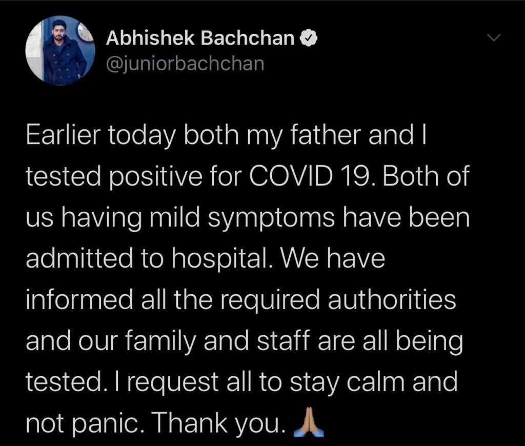 वही एक दूसरे ट्वीट में अभिषेक बच्चन ने भी जानकारी साझा की है कि उनका भी रिपोर्ट पॉजिटिव आया है। अभिषेख ने “जनता से अपील की है कि आप सभी संयम बनाये रखे।BMC को हमने प्राथमिक जानकारी दे दिए हैं।और उनका सहयोग मिल रहा है।आप सभी का धन्यवाद।”