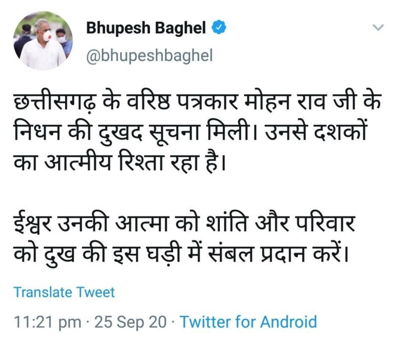 वहीं मुख्यमंत्री भुपेश बघेल ने भी अपनी संवेदना ट्विटर के माध्यम से प्रकट की।उन्हों उनके साथ बिताए पल को याद कर अपना दुख व्यक्त किया।