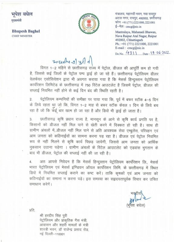 इसे देखते हुए मुख्यमंत्री भूपेश बघेल ने रविवार को पेट्रोलियम मंत्री हरदीप पूरी को पत्र लिखा है। जिसमे उन्होंने किसानों और छत्तीसगढ़ के नागरिकों को पेट्रोल-डीजल की कमी से हो रही समस्या से अवगत कराते हुए छत्तीसगढ़ में स्थित सभी पेट्रोलियम कंपनियों के डिपो में पेट्रोल-डीजल की नियमित सप्लाई का आग्रह किया है।