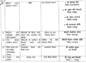 घोषणा के अनुसार, इस वर्ष शहीद वीर नारायण सम्मान हिरेश सिन्हा को प्रदान किया जाएगा। वहीं, यति यतन लाल सम्मान भारतीय कुष्ठ निवारण संघ जांजगीर को और गुण्डाधुर सम्मान राजनांदगांव की ज्ञानेश्वरी यादव को दिया जाएगा।