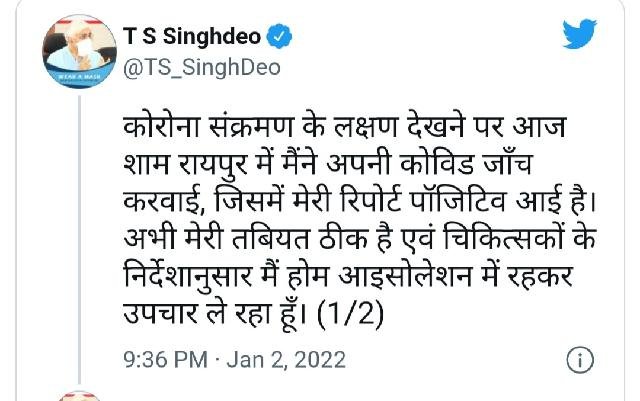 राज्य के स्वास्थ्य मंत्री टीएस सिंह ने ट्विटर के जरिए बताया, कोरोना संक्रमण के लक्षण दिखने पर आज शाम रायपुर में मैंने अपनी कोविड जांच करवाई, जिसमें मेरी रिपोर्ट पॉजिटिव आई है. अभी मेरी तबियत ठीक है और चिकित्सकों के निर्देशानुसार मैं होम आइसोलेशन में रहकर उपचार ले रहा हूं.