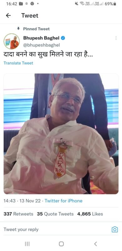 मुख्यमंत्री ने ट्वीट कर यह खुशखबरी अपने लोगो के साथ बांट है। अपने जेब में उन्होंने एक ब्रोच लगाया है जिसमे dada to be लिखा है। उन्होंने लिखा है की दादा बनने की खुशी मिलने जा रही है। इसके बाद से ही लोगो ने उन्हें बधाई देने का सिलसिला शुरू कर दिया है।