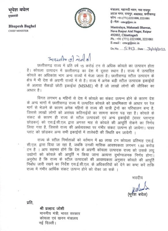 मुख्यमंत्री श्री @bhupeshbaghel ने केंद्रीय कोयला एवं खनन मंत्री श्री @JoshiPralhad को पत्र लिखकर ,छत्तीसगढ़ के स्टील उद्योगों को उनकी आवश्यकतानुसार निर्बाध रूप से कोयला आपूर्ति करने के लिए @secl_cil को निर्देशित करने का किया अनुरोध। (1/2) pic.twitter.com/iTS7z8DJxm