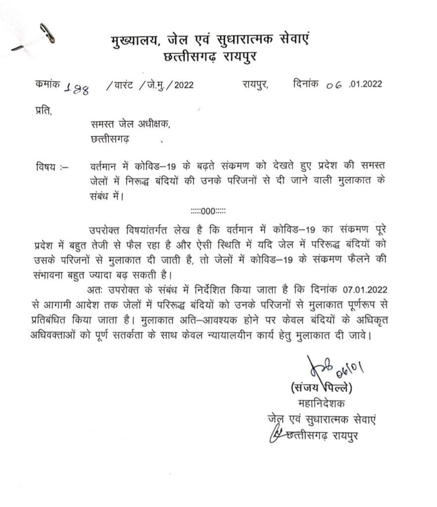 आदेशानुसार यदि जेल में परिरूद्ध बंदियों को उसके परिजनों से मुलाकात दी जाती है, तो जेलों में कोविड-19 के संक्रमण फैलने की संभावना बहुत ज्यादा बढ़ सकती है। इसलिये दिनांक 07.01.2022 से आगामी आदेश तक जेलों में परिरूद्ध बंदियों को उनके परिजनों से मुलाकात को पूर्णरूप से प्रतिबंधित कर दिया गया है।