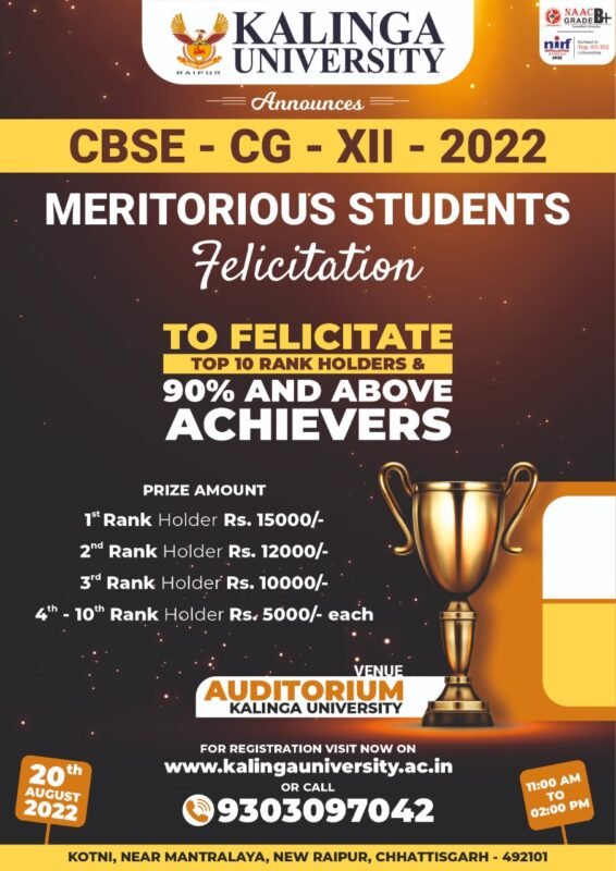 पिछले 8 वर्षों से कलिंगा विश्वविद्यालय छत्तीसगढ़ राज्य के विद्यार्थियों के प्रतिभा को निखारने, प्रेरित करने और प्रोत्साहित करने के लिए विभिन्न कार्यक्रमों का आयोजन करता रहा है। इसी परंपरा को ध्यान में रखते हुए कलिंगा विश्वविद्यालय के द्वारा वर्ष 2022 में बारहवीं की कक्षा के टॉपर विद्यार्थी और 90% से अधिक अंक प्राप्त करने वाले प्रतिभावान विद्यार्थियों के लिए “सीबीएसई, बारहवीं – 2022, मेधावी विद्यार्थी सम्मान समारोह” का आयोजन किया जा रहा है। इस सम्मान समारोह में छत्तीसगढ़ राज्य में प्रथम स्थान प्राप्त करने वाले विद्यार्थी को 15,000 की नगद् राशि,द्वितीय स्थान प्राप्त करने वाले विद्यार्थी को 12,000 की नगद् राशि, तृतीय स्थान प्राप्त करने वाले विद्यार्थी को 10,000 की नगद् राशि और चतुर्थ से दशम स्थान प्राप्त करने वाले विद्यार्थियों को 5000 की नगद् राशि प्रदान की जाएगी। इसके अतिरिक्त इन विद्यार्थियों को सम्मानपत्र दिया जाएगा।अगर यह विद्यार्थी अपने आगे की उच्च शिक्षा कलिंगा विश्वविद्यालय में करते हैं तो उन्हें स्कॉलरशिप के रुप में 100 % शिक्षण शुल्क से छूट दी जाएगी।