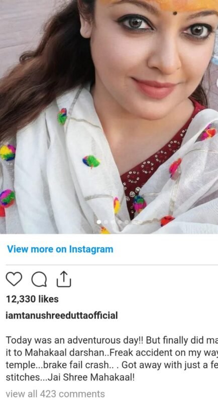 मुंबई। अभिनेत्री तनुश्री दत्ता को लेकर खबर सामने आई है पर इस बार चर्चा उनके लुक की नहीं बल्कि उनके एक्सीडेस्ट से जुड़ी घटना की है। वह एक सड़क हादसे का शिकार हो गई है। महाकल के दर्शन के लिए जाते समय उनका एक्सीडेंट हो गया। इस बात की जानकारी खुद अभिनेत्री तनुश्री दत्ता ने सोशल मीडिया पर अपनी चोट की एक फोटो साझाकर फैंस को दी है।