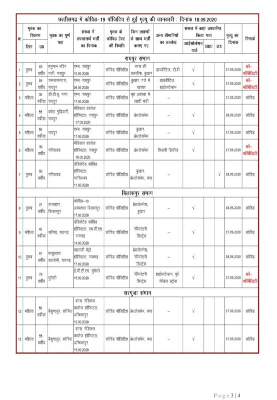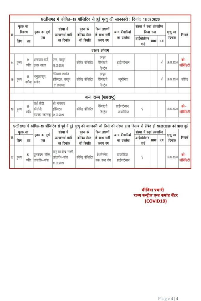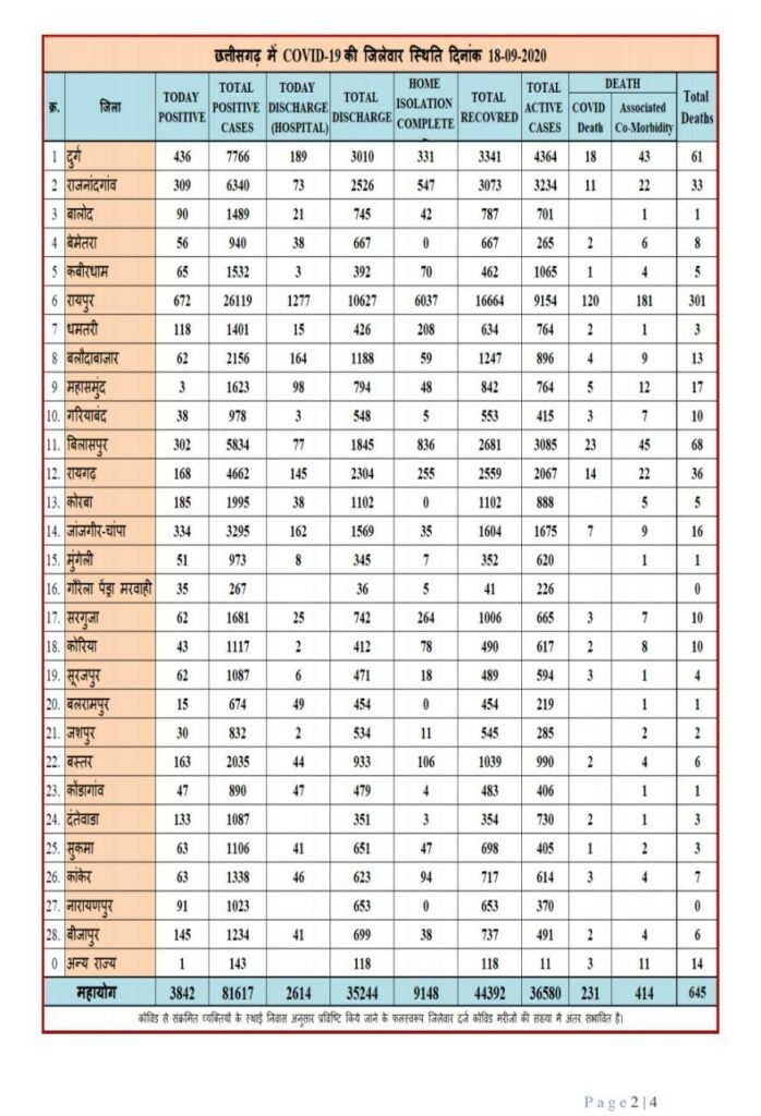 स्वास्थ्य विभाग ने अपने मेडिकल बुलेटिन में यह जानकारी बताया कि शुक्रवार को पाए गए 3842 कोरोना संक्रमित मरीजों में से जिला रायपुर से 672, दुर्ग से 436 ,जांजगीर-चांपा से 334, राजनांदगांव से 309, बिलासपुर से 302, कोरबा से 185, रायगढ़ से 168, बस्तर से 163, बीजापुर से 145, दंतेवाड़ा से 133, धमतरी से 118, नारायणपुर से 91, बालोद से 90, कबीरधाम से 65, सुकमा से 63, कांकेर से 63, बलौदाबाजार से 62, सूरजपुर से 62, सरगुजा से 62, बेमेतरा से 56, मुंगेली से 51, कोण्डागांव से 47, कोरिया से 43, गरियाबंद से 38, गौरेला-पेण्ड्रा-मरवाही से 35, जशपुर से 30, बलरामपुर से 15, महासमुन्द से 3 और अन्य राज्य से एक मरीज शामिल है। शुक्रवार को पाए गए सभी मरीजों की अस्पतालों में भर्ती प्रक्रिया जारी है। प्रदेश में इस समय कोरोना के एक्टिव मरीजों की संख्या 36 हजार 580 है। स्वास्थ्य विभाग ने बताया कि प्रदेश में पिछले 24 घंटों के दौरान कोरोना संक्रमण से 10 और विभिन्न बीमारियों से पीडि़त कोरोना पॉजिटिव 7 मरीजों की मृत्यु हुई है। इस प्रकार कुल 17 लोगों की मौत हुई है।
