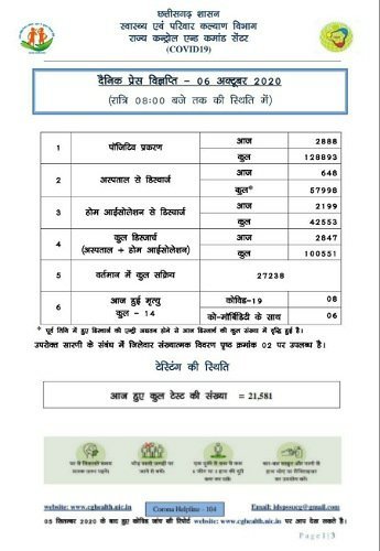 रायपुर। छत्तीसगढ़ में मंगलवार को 2888 कोरोना पॉजिटिव मरीजों की पहचान हुई है। 2847 मरीज स्वस्थ हुए हैं। 14 मरीजों की मौत हुई है। पूर्व की 9 मौत की जानकारी विभाग को आज मिली है। स्वास्थ्य विभाग ने रात 8 बजे की स्थिति में मेडिकल बुलेटिन जारी की है। प्रदेश में अब तक 128893 मरीजों की पहचान हो चुकी है। इनमें से 100551 मरीज स्वस्थ हो चुके हैं। 1104 मरीजों की मौत हो चुकी है। प्रदेश में एक्टिव केस 27238 हैं।