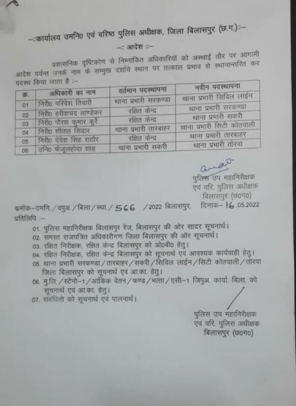 बिलासपुर। बिलासपुर जिला में पुलिस विभाग में तबादला हुआ है। बिलासपुर एसएसपी पारुल माथुर ने यह ट्रांसफर सूची जारी की है, जिसमें निरीक्षकों का ट्रांसफर हुआ है। इस तबादल लिस्ट में 6 थाना प्रभारियों का स्थान परिवर्तन किया गया है।